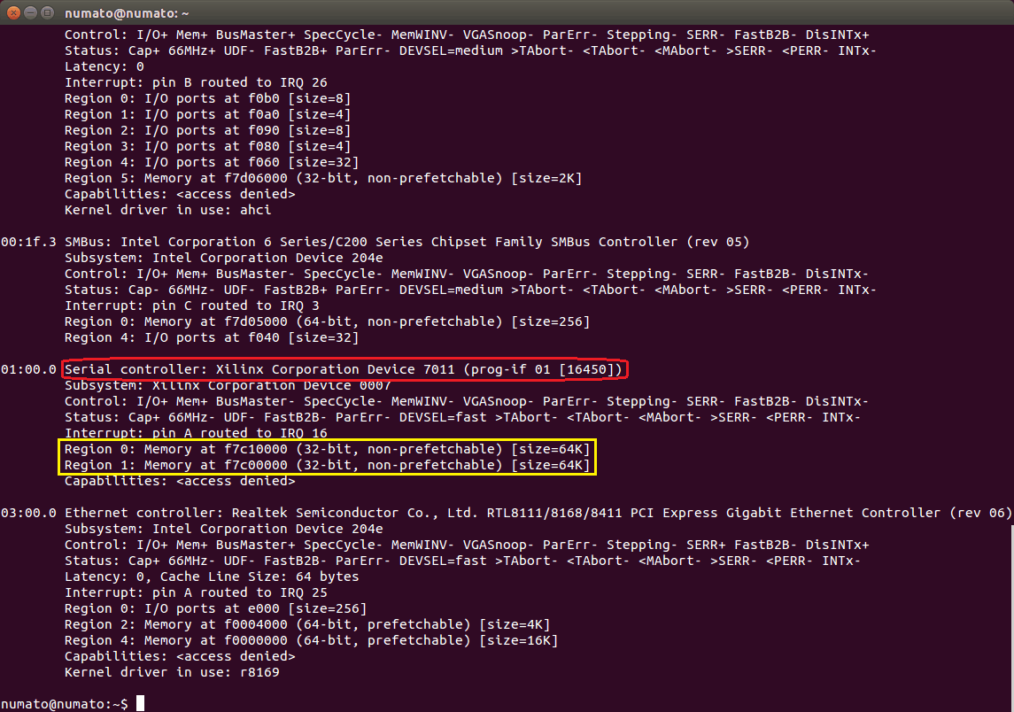 If the host is unable to detect Tagus (which should show up as “Serial controller: Xilinx Corporation Device 7011” as in the image below), make sure the board is inserted correctly into PCIe Slot and do a soft reset after the host is powered up. A soft-reset after the host is powered up helps the host detect FPGA-based PCIe devices.