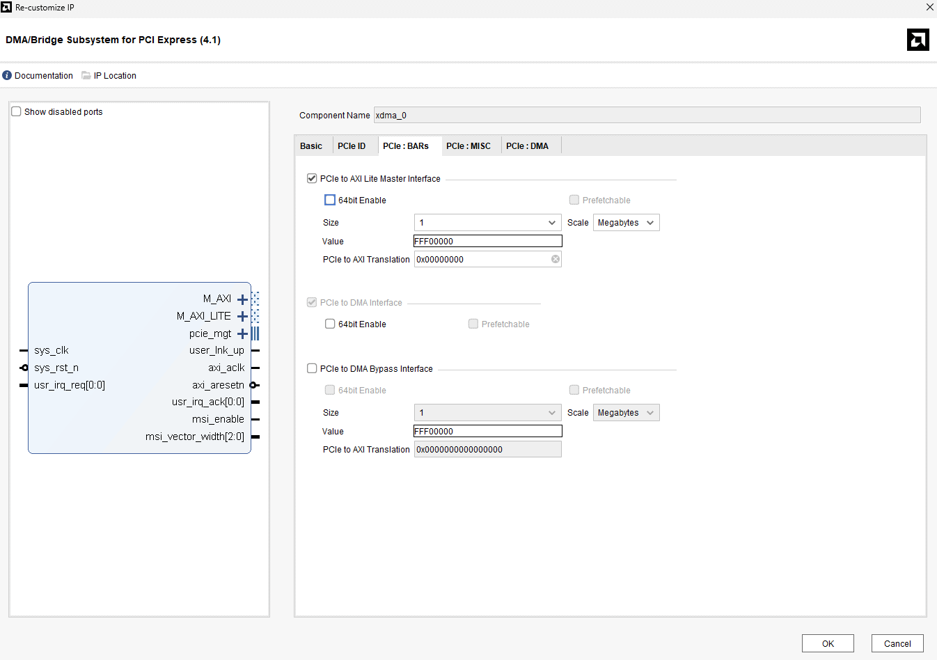 - In the “PCIe: BARs” tab, enable “PCIe to AXI Lite Master Interface” and set the Size Value as “1 Megabyte”.