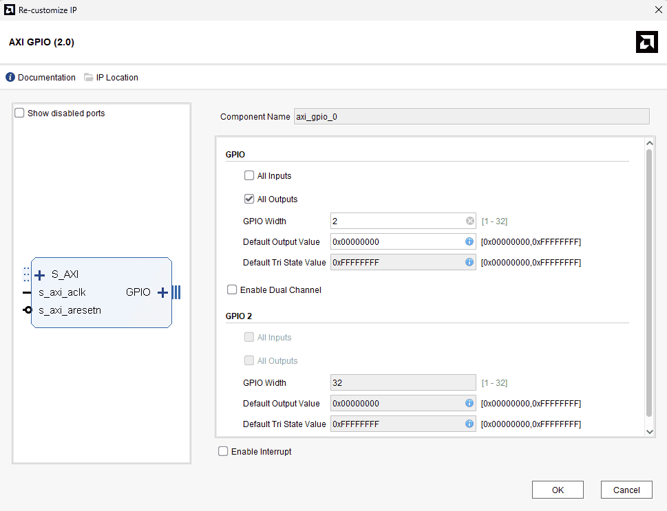 Double click “AXI GPIO” IP core to customize it. In the “IP Configuration” tab, change the ”GPIO Width” to 2 and enable the “All Outputs” option.