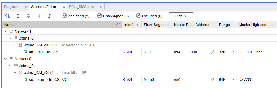 In the “Address Editor” tab, change the Offset Address and Range of axi_bram_ctrl_0 to “0x0000_0000_0000_0000” and “64K” respectively. Also, change the Range of axi_gpio_0 to “32K” as shown in the following image.