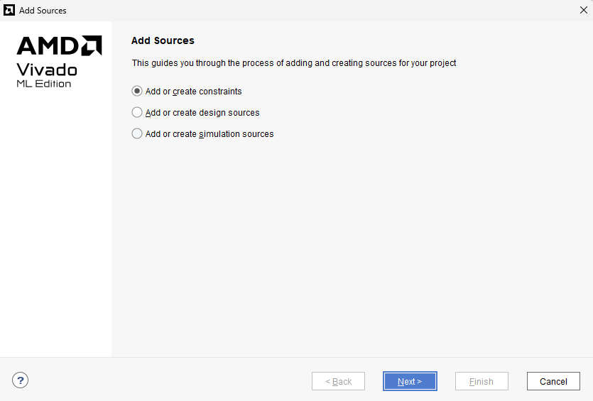 Once the wrapper is complete, we will add constraints for the required ports. Since we have BSP, most of the ports would be assigned from the BSP. For a few ports, we will have to manually assign them. Click “Add Sources” in the Sources window and in the next wizard select “Add or create constraints” and click “Next” to proceed.