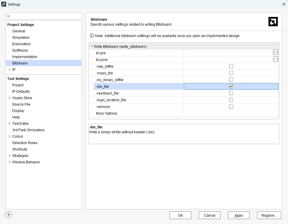 Right-click on “Generate Bitstream” under “PROGRAM AND DEBUG” in the “Flow Navigator” panel and select “Bitstream Settings”. Enable the “-bin_file” checkbox and click “OK“.