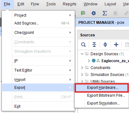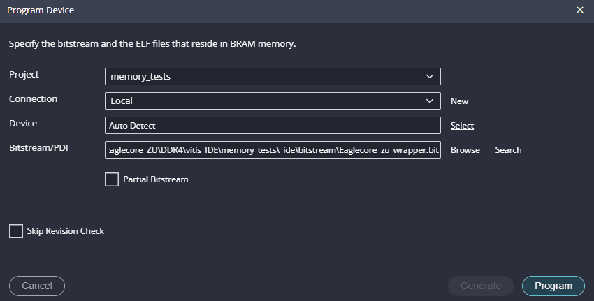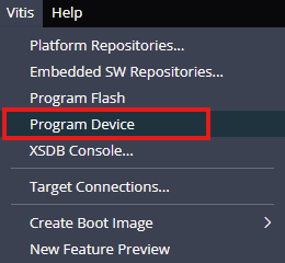 Program the FPGA on EagleCore ZU with a simple boot loop program by selecting the Program Device option from the Vitis menu.
