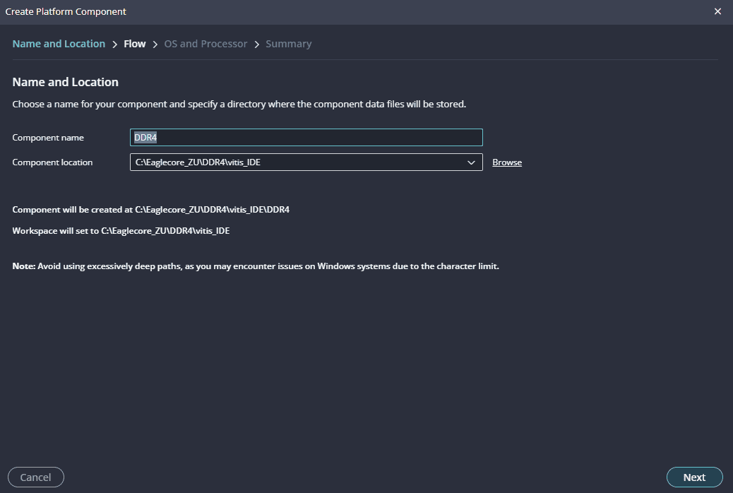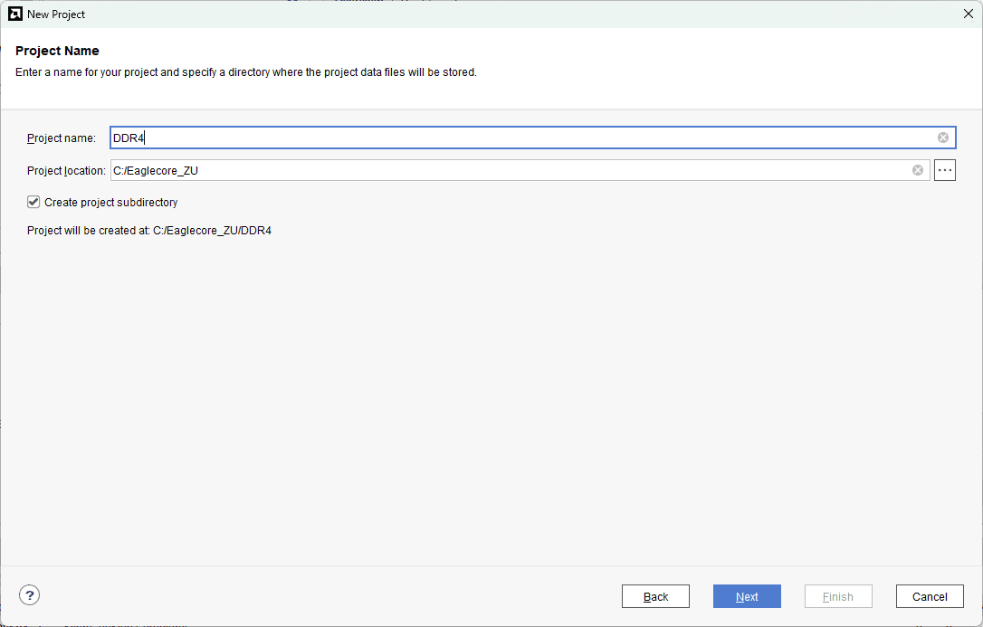 Type in a project name and save it at a convenient location. For this example “DDR4” is used as project name, but feel free to use any name. Select the check box below to keep all project files in a single folder. The image below shows the settings for the example project. Click “Next” to continue.