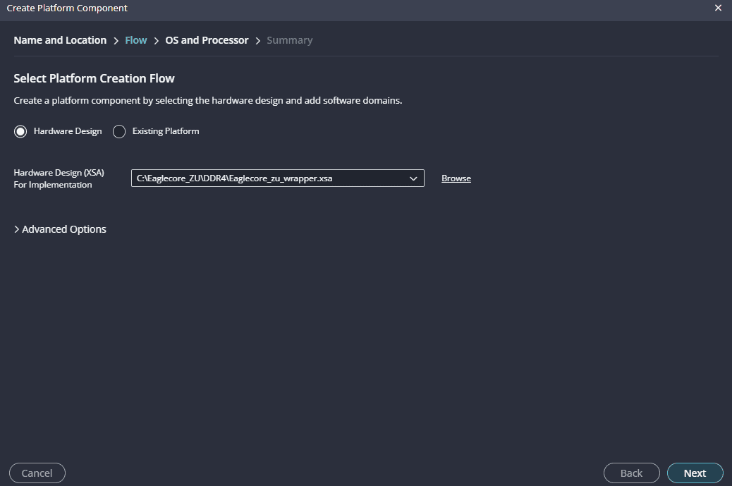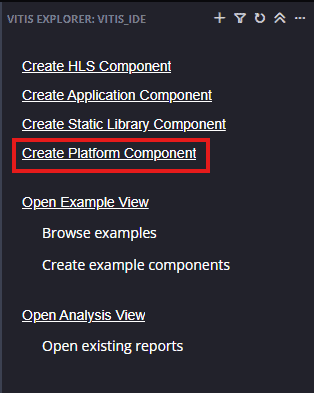Create a new platform for the project, by selecting “Create Platform Component”, click “Next”, in the Flow tab select the XSA file saved using the step 12 and finally click “Next” and “Finish” respectively.