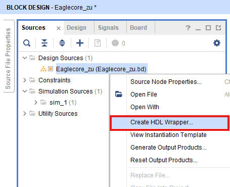 Go to “Sources” tab, right click on “Eaglecore_zu” design file and select “Create HDL Wrapper”. Click OK on the window that appears to finish generating wrapper.