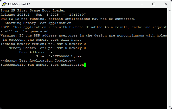 If everything went well, the application running on the board should print the memory testing Process over the UART and should be displayed on the Serial Terminal application.