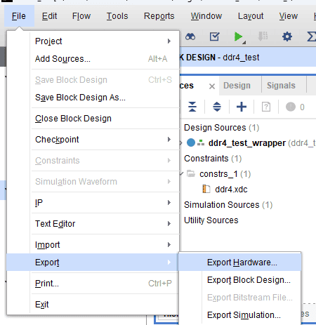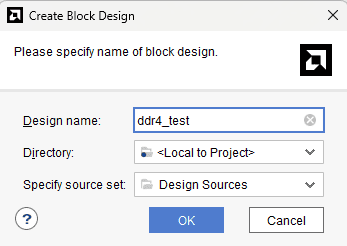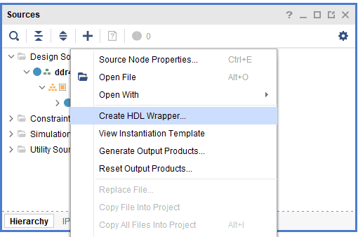 Right-click “ddr4_test” in the “Sources” window, and select “Create HDL Wrapper” from the popup menu. Click “OK” on the window that appears to finish generating a wrapper.
