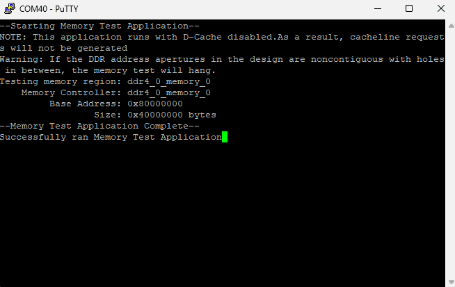 If everything went well, the Memory tests application running on the board should start printing the Memory tests over the UART and the output should be displayed on the Serial Terminal application as shown in the image below.