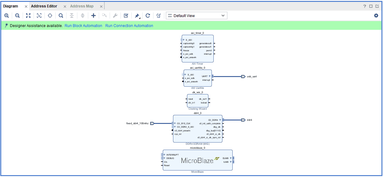 Add DDR4 and USB UART to the design by double-clicking the corresponding peripherals. In the Diagram window, right-click and select “Add IP” from the popup menu. Search for “MicroBlaze” ,”clocking wizard” & “AXI Timer” and add them to the design by double-clicking them.
