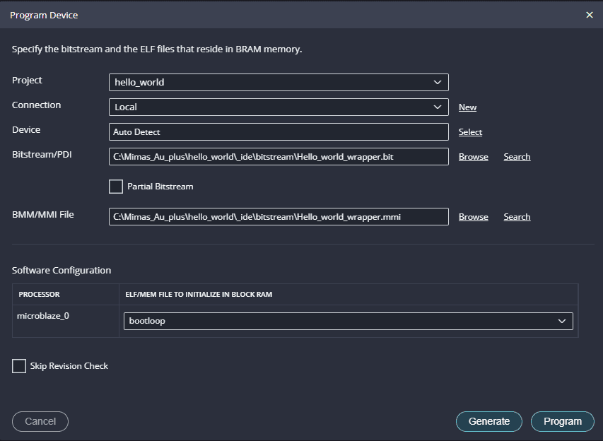 Program the FPGA on Mimas AU Plus with a simple boot loop program by selecting the Program Device option from the Vitis menu.