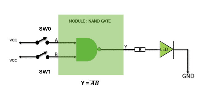 Let’s come back to our module and think about how we can implement the same on the hardware. The module in question is an NAND gate. As we know, the output of an NAND gate is low only when both the inputs are high and the output is high if any of the inputs are low. We can have many possible hardware configurations to test this module. The easiest would be with a switch and an LED. See the proposed hardware configuration in the picture below.