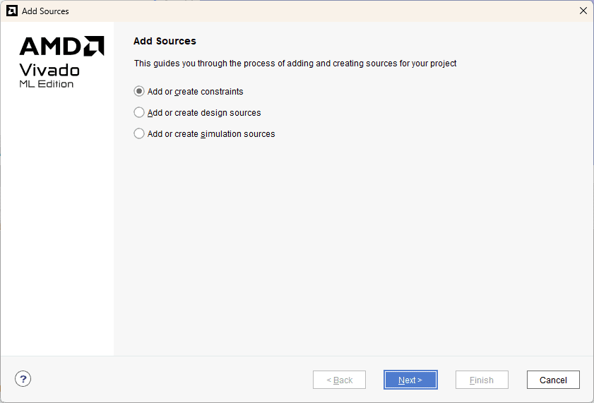 Go to “Add Sources” under the Flow Navigator –> PROJECT MANAGER window, select the “Add or create constraints” and click “Next”.