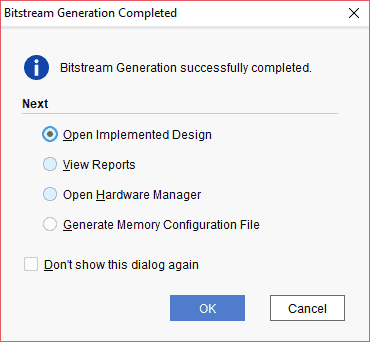 Once the bitstream generation is completed, if everything goes well and there are no errors, the following window will be displayed.