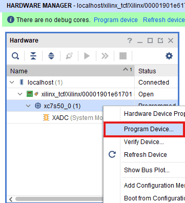 Now, right click on the device “xc7s50_0(1)”and click “Program Device”.