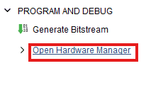 - Once the Bitstream is generated successfully, expand the “Open Hardware Manager” under “PROGRAM AND DEBUG” section of Flow Navigator panel.