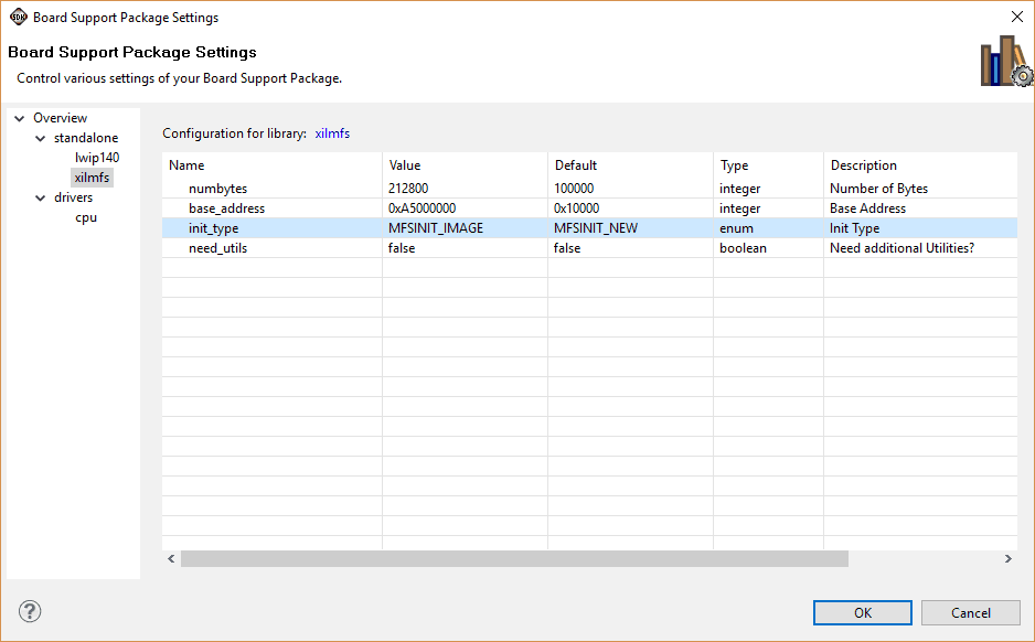 Open ‘xilmfs’ library configuration, and change the settings as shown below, ‘numbytes’ is the size of MFS image in bytes. Click ‘OK’ and build the project in case it is not built automatically.