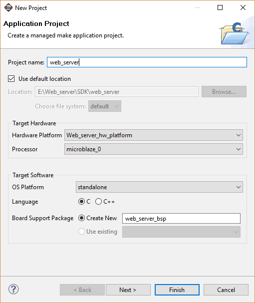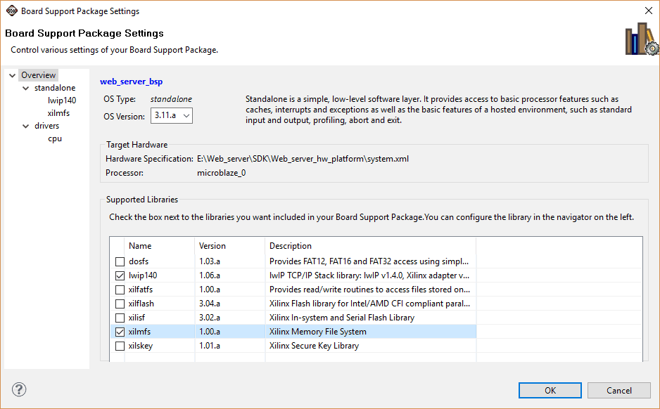 In ‘Project Explorer’, right-click on ‘web_server_bsp’ and select ‘Board Support Package Settings’. From the supported libraries list, select ‘lwip140’ and ‘xilmfs’.