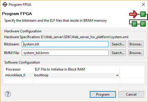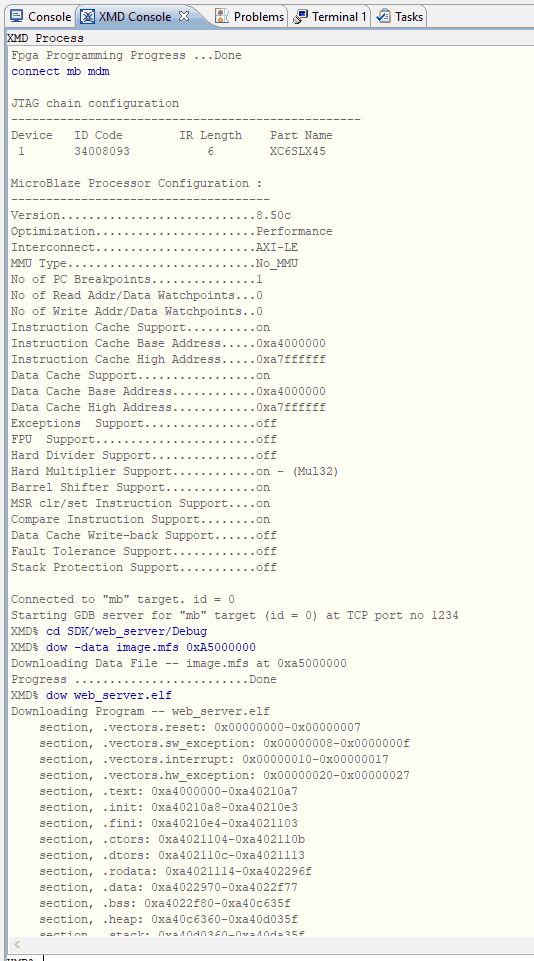 Once the design is ready, MFS (Memory File System) image needs to be written to memory for testing the web server. The MFS image contains the index.html file which is opened and read when the web server receives GET command i.e. when a client requests a web page.