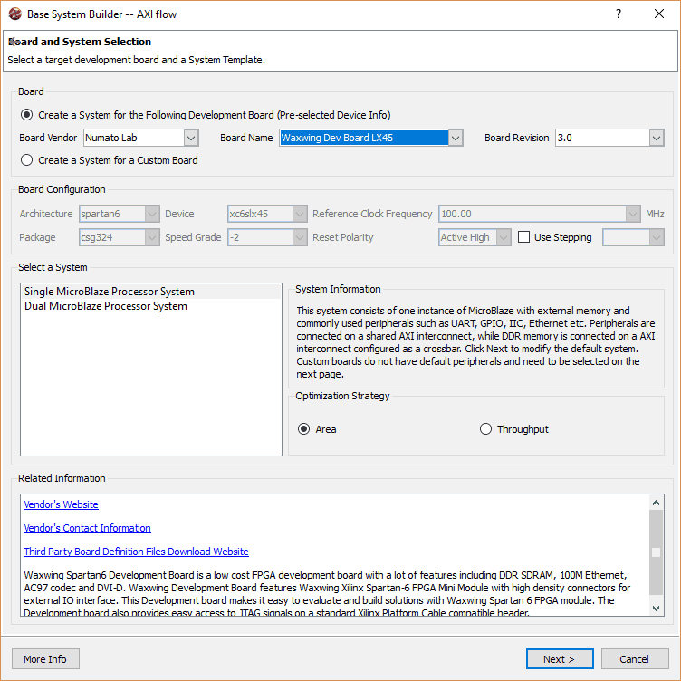 In ‘Board and System Selection’ page, select Board Vendor as ‘Numato Lab’ and Board Name as ‘Waxwing Dev Board LX45’. Click ‘Next’.
