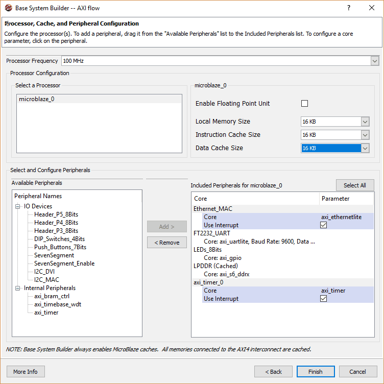 In ‘Processor, Cache and Peripheral Configuration’ page, select local memory size as 16 KB and include peripherals as shown below. Select ‘Use Interrupt’ for Ethernet_MAC and axi_timer IP cores and click Finish. It will create a new project with the selected settings.