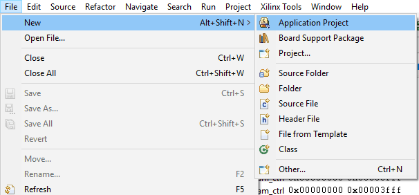 In Xilinx SDK, select File -> New -> Application Project.