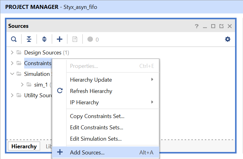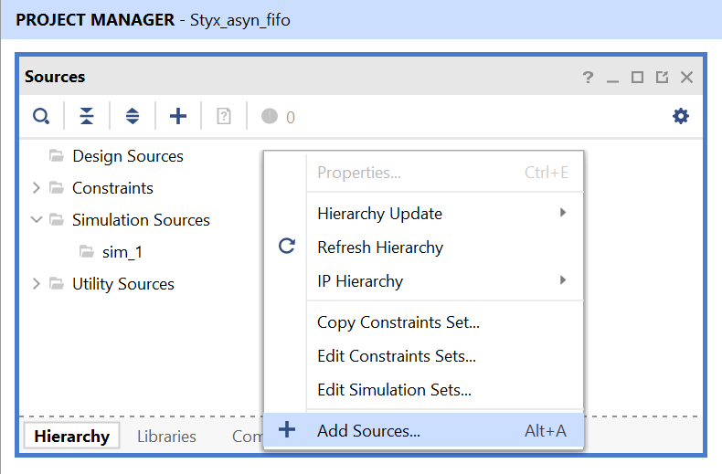 Right-Click  on ‘Design Sources’ and select ‘Add Sources’. It will open a configuration window for adding Verilog files.
