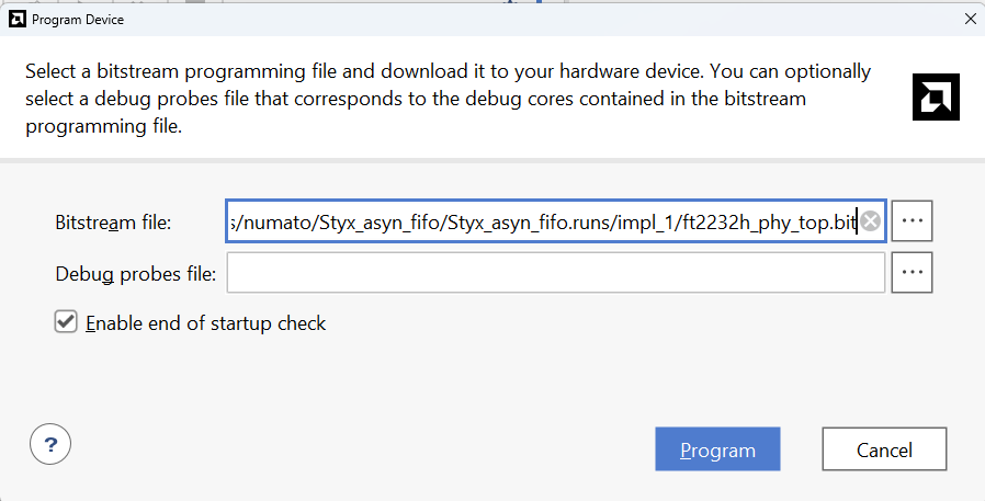 Dialog window for programming will open. Program the bit file by clicking ‘Program’.