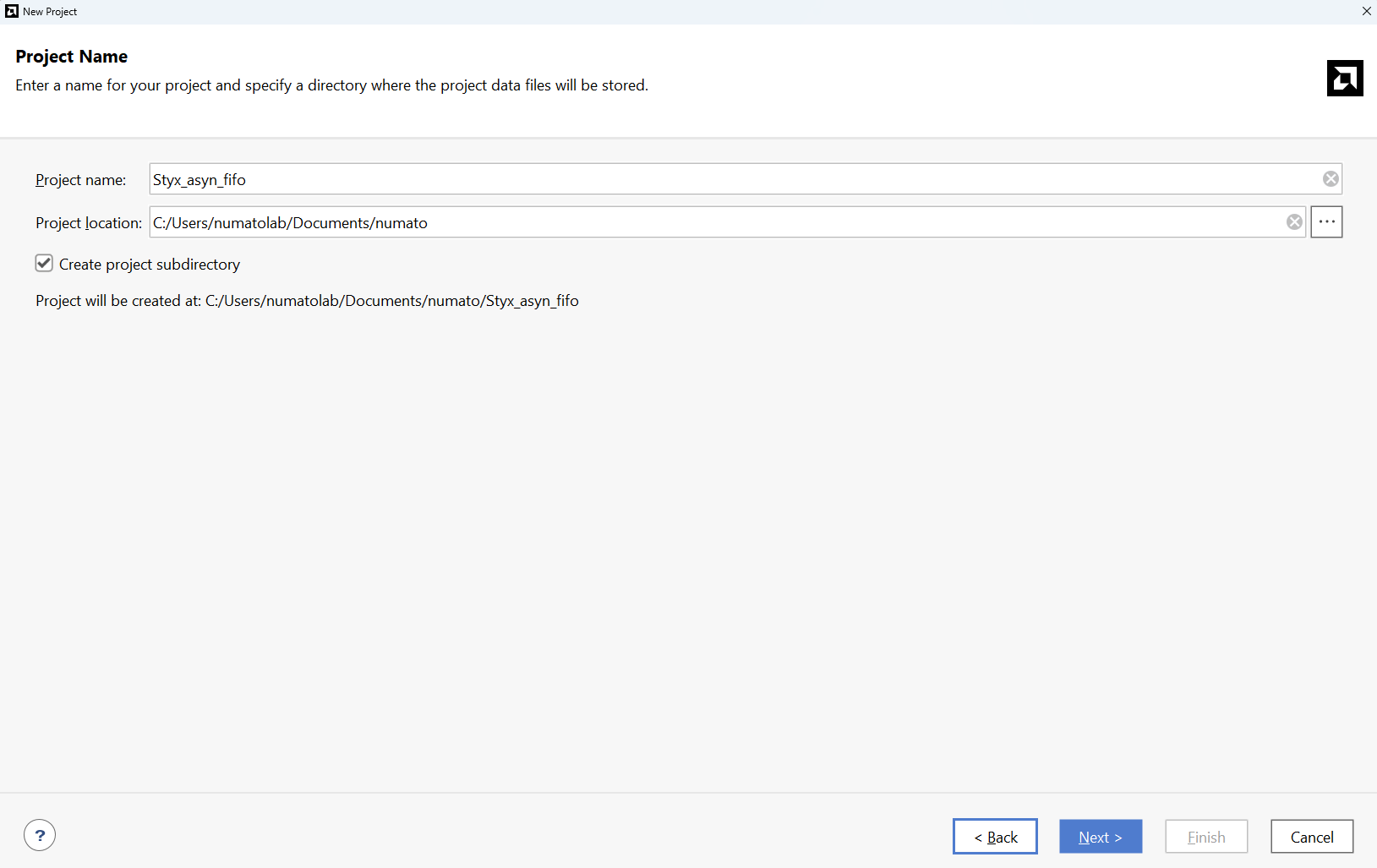 Type in a project name and save it at a convenient location. For this example “Styx_asyn_fifo” is used as project name, but feel free to use any name. Select the check box below to keep all project files in a single folder. The image below shows the settings for the example project. Click “Next” to continue.