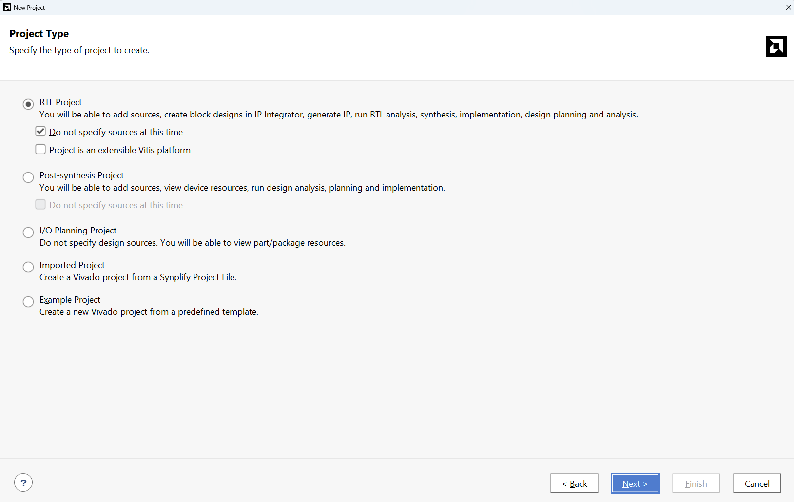 Choose “RTL Project” as project type and check the option “Do not specify sources at this time”