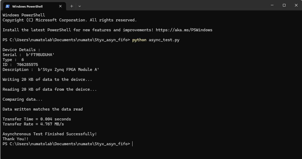 The FTDI FT2232H USB 2.0 chip on-board Styx provides users with a FIFO interface for data transfer between FPGA and host PC. The FT2232H chip features two channels or ports, which can be configured into various modes like UART, FIFO, JTAG etc. On Styx, Channel B is used for FPGA configuration and flash programming, whereas channel A is for custom usage. This article demonstrates communication between host and the board using Asynchronous FIFO mode via boards’ respective channels of FT2232H. The Channel A of FT2232H in case of Styx , when configured as FIFO, acts as a USB-FIFO bridge between host and FPGA.