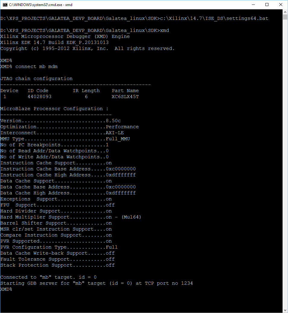 Make sure to replace 14.7 with your ISE version and to choose settings32.bat if your system is 32 bit. These commands will start XMD within the commandline window. Now type the following command at the XMD command line to connect to the Microblaze processor running on the FPGA.