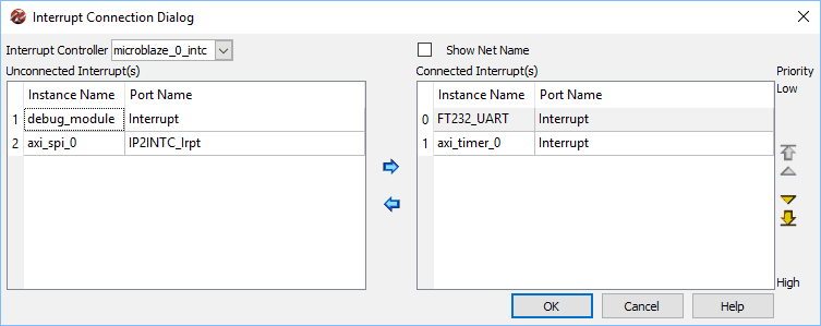 In the interrupt control dialog box, make sure that both FT232_UART and axi_timer_0 are connected to the interrupt controller and debug_module and axi_spi_0 are not connected to the interrupt controller as shown in the image below.