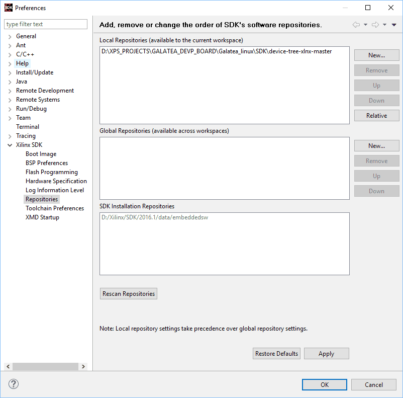 Step 3: In the Dialog window, we have a section named “Local Repositories”. Select “New” and select the device tree folder which you had downloaded and extracted to SDK workspace. Final result should look like in the below image.