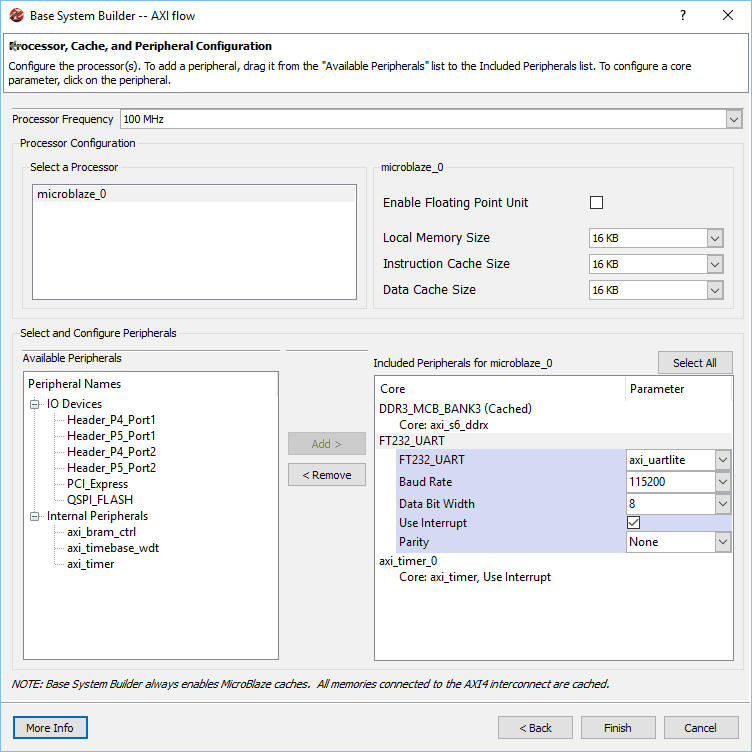 By default, FT232_UARTand DDR3_MCB_BANK3 will be selected. Select memory size, I-cache size and D-cache size as 16KB. Then select FT232_UART peripheral and set the baud rate to 115200 and check the “Use Interrupt” check box. Then select “axi_timer” in the “Available Peripherals” list and add that to the system. Select the timer and check the “Use Interrupt” check box. Make sure everything is setup as shown in the image below and click “Finish” button.