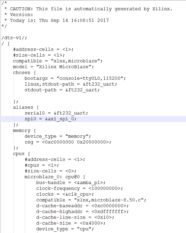Step 5: We have to merge the ‘.dtsi’ and ‘.dts’ files. So open both of them in some text editor (Notepad++ etc) and copy the contents of system.dts and paste them in the .dtsi file just after the line ” model = “Xilinx MicroBlaze” . Don’t forget to add “/dts-v1/;” at the top of .dtsi file also. The final content should look like this