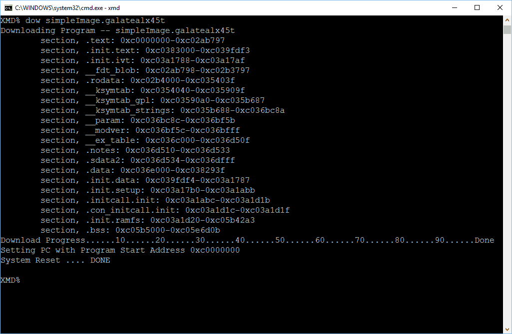 Step 2: Once FPGA programming is finished, we can now communicate with the Microblaze processor through XMD. It is possible to invoke XMD within SDK but I found it very easy and convenient to invoke XMD in a standalone commandline (DOS) window. Before starting XMD, copy “simpleImage.galatealx45t” in the folder /output/images under buildroot directory on Linux build machine to the Windows machine. Open a new commandline window (in Windows) where the kernel image is copied and run the following commands.