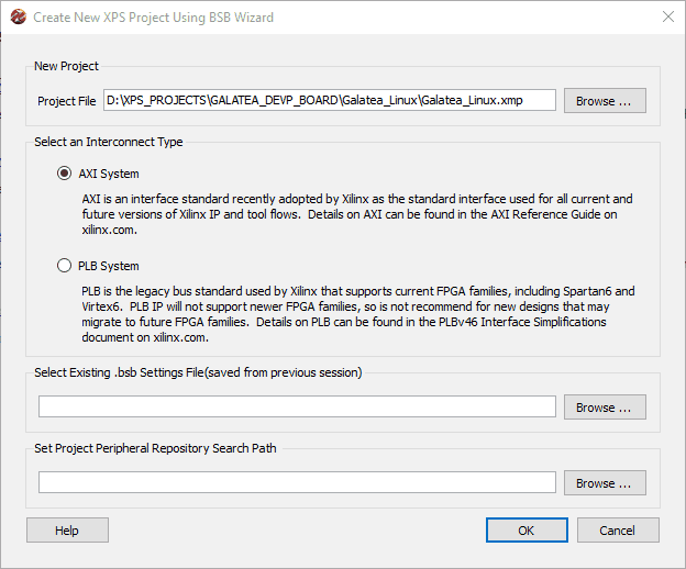 For this section we are building Microblaze based embedded platform for Linux using Xilinx EDK. Now let’s get started. We will need to use XPS Base System Builder (BSB) to create a new project. To make the process easier, download BSB Wizard files from here and copy to the folder “C:\Xilinx\xx.xx\ISE_DS\EDK\board”. Once extracted, the complete path to the file should look like C:\Xilinx\xx.xx\ISE_DS\EDK\board\NumatoLab\ipxact\GalateaPCIeDevBoardLX45T_V1\data”. Now go to All Programs > Xilinx Design Tools > EDK and start Xilinx Platform Studio. Once XPS is loaded, click on “New BSB Project” under File menu or press Ctrl + Shift + B to invoke the BSB wizard. If everything went fine, you should be presented with BSB wizard window as shown below.