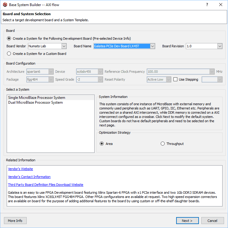Enter path to a folder where you want to store the project and a project name (Here the project name is Galatea_Linux in the image above). Select AXI System in the interconnect Type section and click OK. In the next page of the wizard, select “Numato Lab” from the Board Vendor combo box (This option should be available if you have placed the BSB wizard support files for Galatea properly as mentioned earlier). Select GalateaPCIeDevBoardLX45T and 1.0 from Board Name and Board version combo boxes respectively and click “Next” to go to the next page: