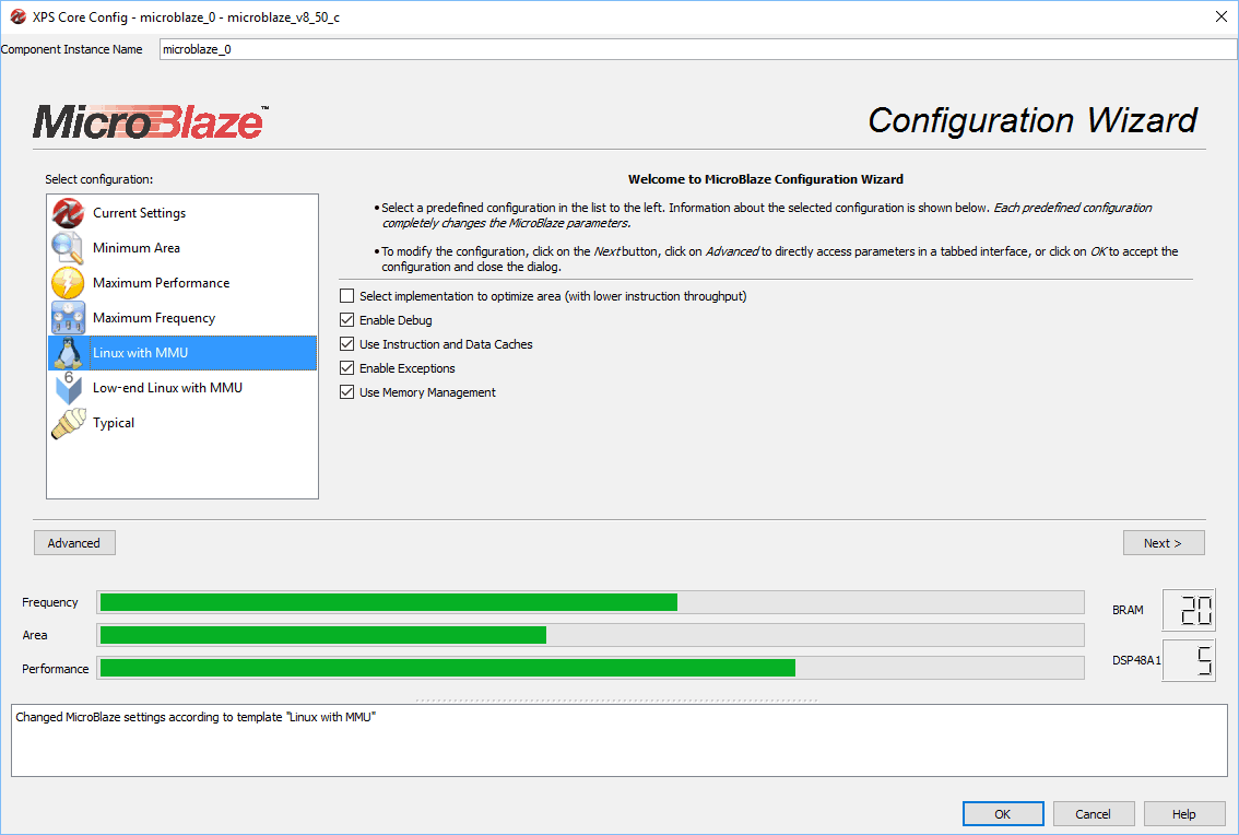Now we will configure the peripheral IPs. Right click on microblaze_0 in the “System Assembly View > Bus Interfaces” tab and select “Configure IP” from the pop up menu. The Microblaze Configuration Wizard will pop up. Select “Linux with MMU” under the “Select Configuration” options (Please see image below).