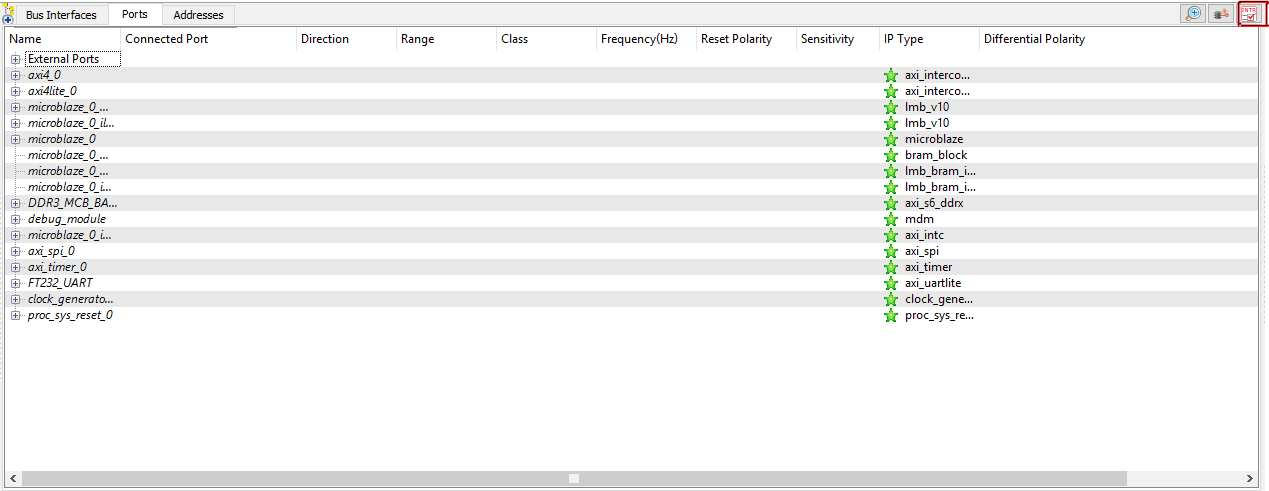 At this point, we have finished configuring Microblaze CPU and all peripherals. The next step is to route all peripheral interrupts to the microblaze CPU through the interrupt controller. To configure interrupts, go to the “Ports” tab in “System Assembly View” and locate the “Open interrupt Control Dialog” button. This button is a little tricky to locate. Please see the image below for help.
