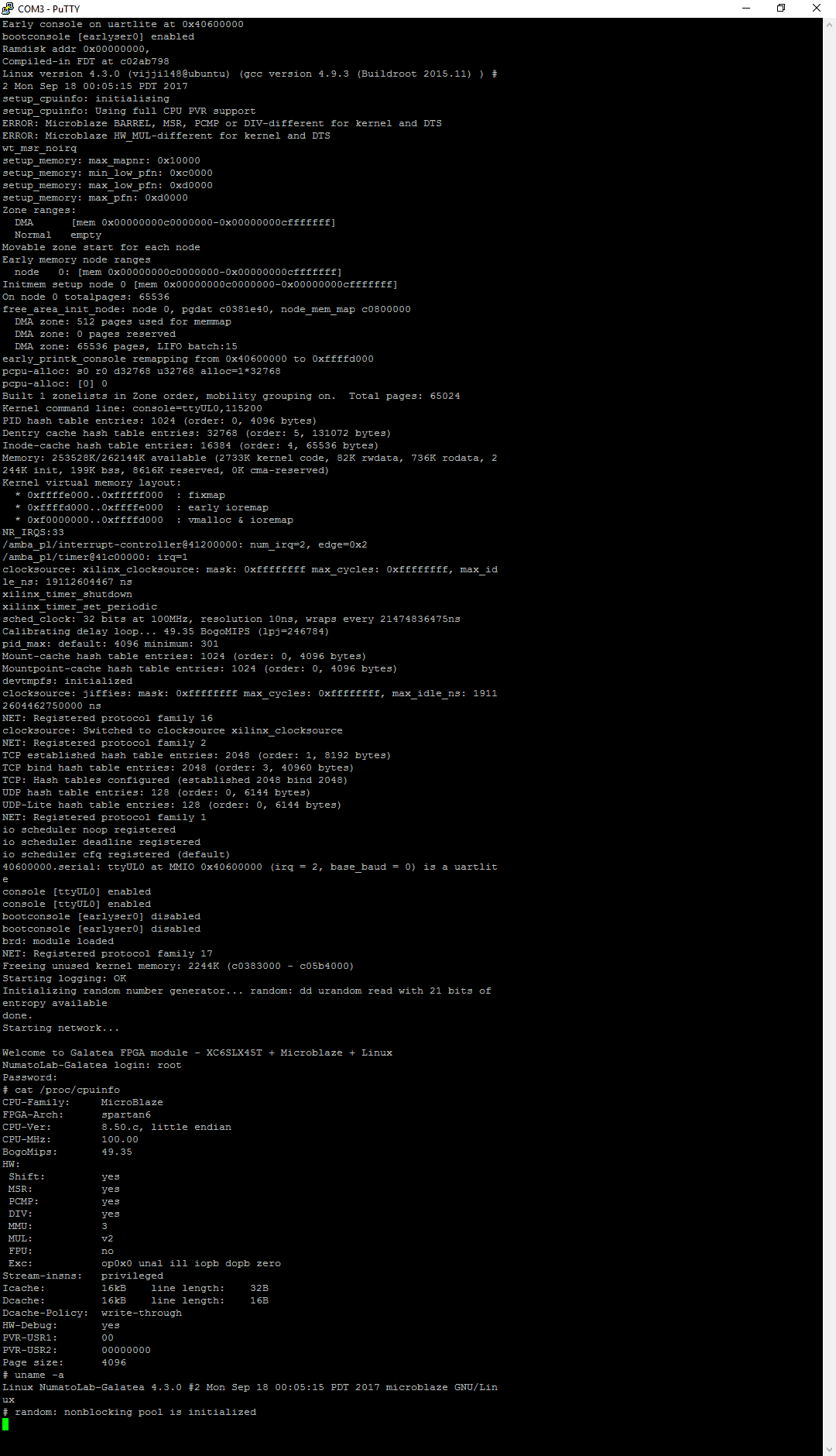 You can login to Linux with username “root” and password as “galatea”. We have a successfully running Linux kernel in Galatea PCI Express Spartan6 FPGA Board! Congratulations! Those who could not successfully boot, please don’t give up and keep trying. You should be able to tackle this without much difficulties.