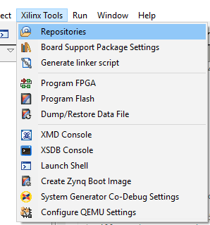 Step 2: In SDK, go to Xilinx Tools -> Repositories.