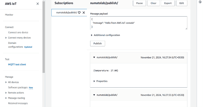 - To verify, go to your device in AWS IoT Core dashboard and open the “MQTT test client” tab, subscribe to the topic you configured you should see live data incoming.
