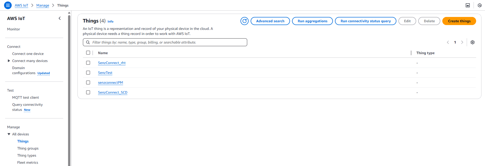 - Once the policy is created navigate to “Things” under “All devices”.