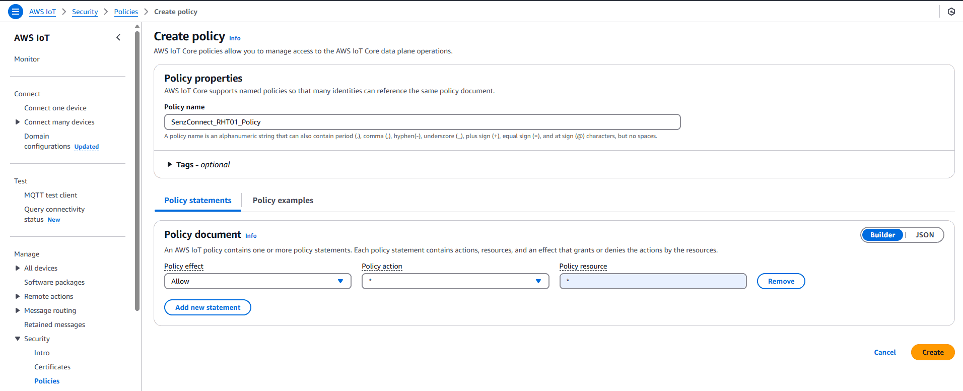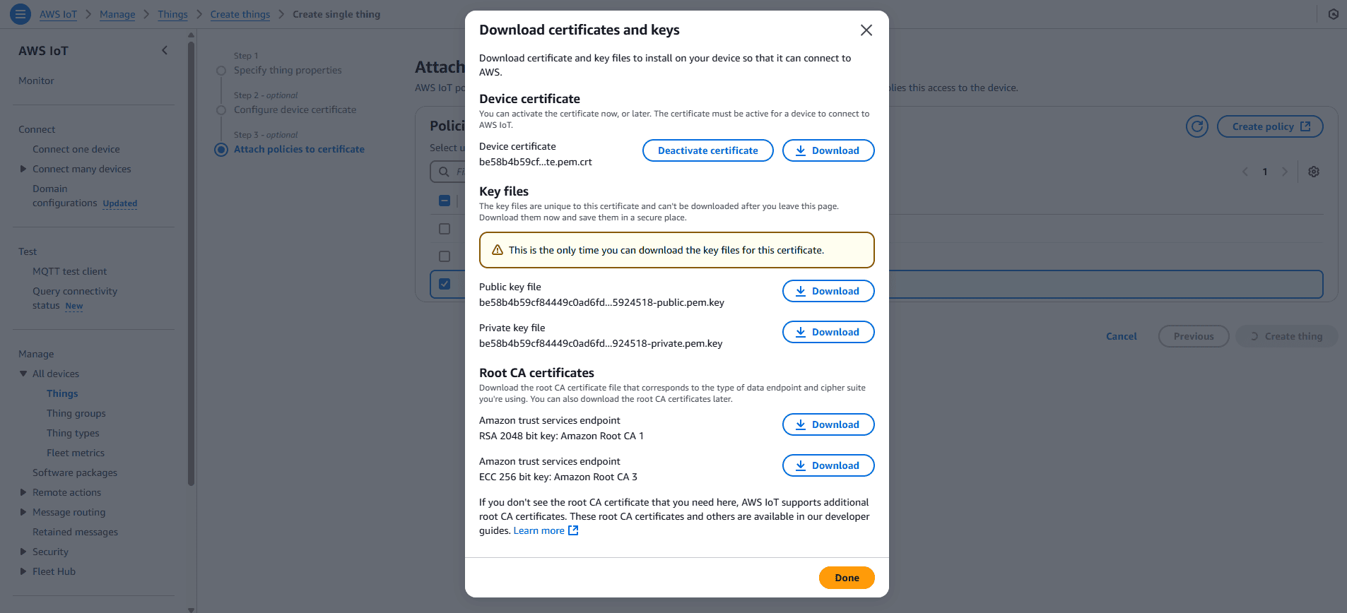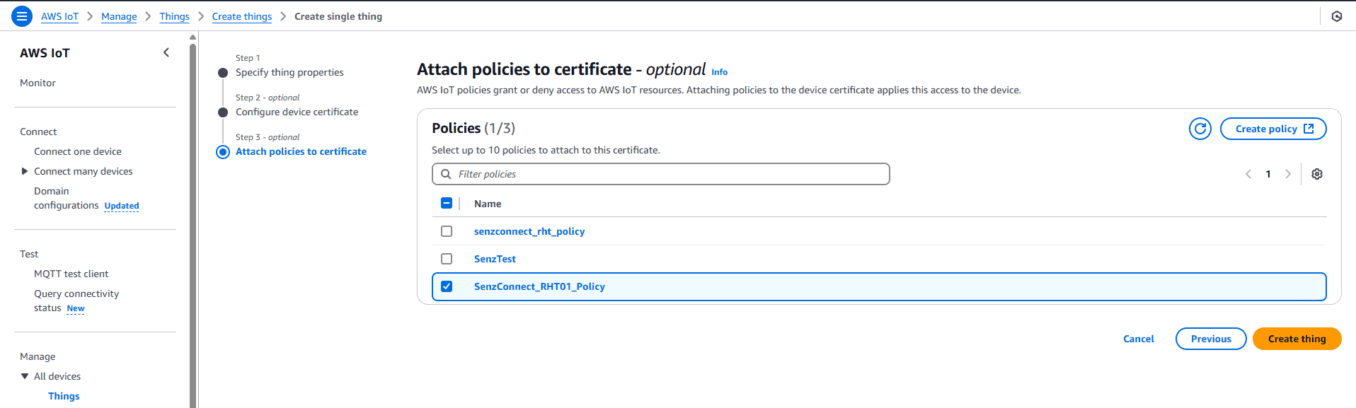 - Attach your respective policy to the certificate and “create thing”.