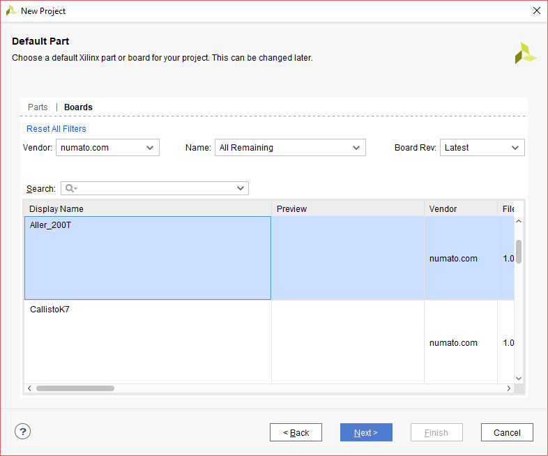 In the “Default Part” wizard, select Boards and choose “numato.com” as Vendor. Select “Aller_200T” and click “Next”. If Aller_200T is not listed, make sure board support files are installed correctly. Click “Finish” in the next wizard. A new Vivado project will open with the selected settings.
