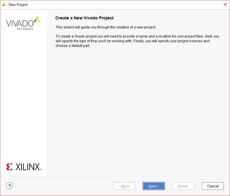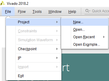 Open Xilinx Vivado Design Suite. Go to File -> Project -> New. The “New Project” wizard will open. Click “Next”.