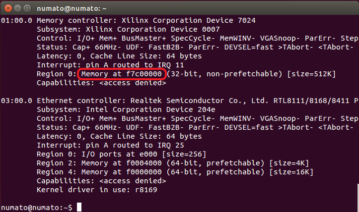 lspci -vv the output of the command is shown below. Make sure the Aller Board is inserted correctly into the PCIe Slot of the host system’s motherboard. If the host is unable to detect Aller (which should show up as “Memory controller: Xilinx Corporation Device 7024” as in the image below), make sure the board is inserted correctly into PCIe Slot and do a soft reset after the host is powered up. A soft-reset after the host is powered up helps the host detect FPGA-based PCIe devices.