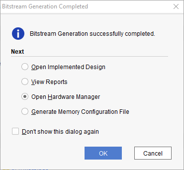 A Dialogue window will appear asking if you want to program the configuration device now. Click Yes and program the .bin bitstream file which is located in “<project location>/ProjectName.runs/impl_1” directory.
